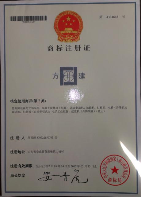 濰坊方建建機(jī)商標(biāo)注冊(cè)證書